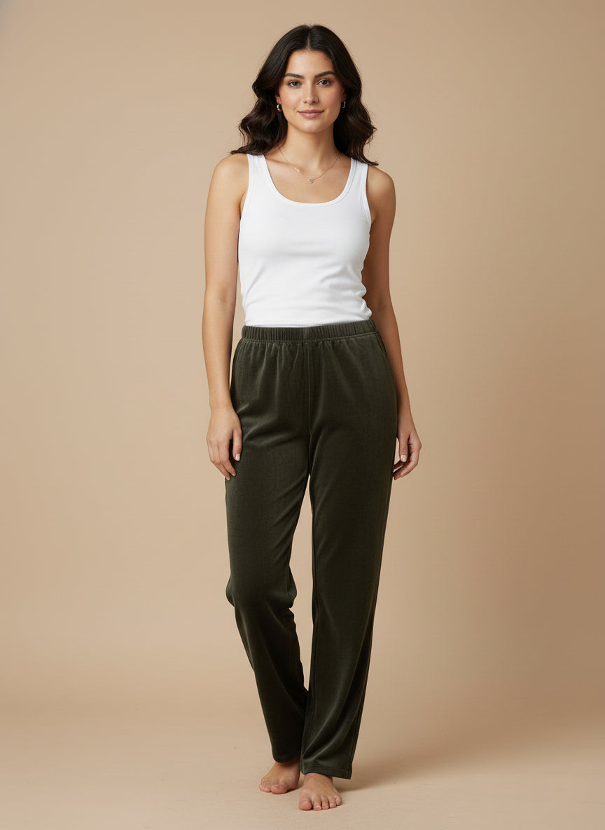 Bawełniane spodnie welurowe, które łączą miękkość, elegancję i wygodę. Wykonane z przyjemnego w dotyku weluru, wyróżniają się subtelnym połyskiem i świetną oddychalnością. Prosty krój z lekko wydłużonymi szerokimi nogawkami optycznie wysmukla sylwetkę, a elastyczna gumka w pasie dopasowuje się do ciała, zapewniając komfort przez cały dzień.