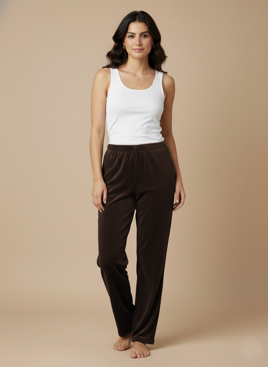 Bawełniane spodnie welurowe, które łączą miękkość, elegancję i wygodę. Wykonane z przyjemnego w dotyku weluru, wyróżniają się subtelnym połyskiem i świetną oddychalnością. Prosty krój z lekko wydłużonymi szerokimi nogawkami optycznie wysmukla sylwetkę, a elastyczna gumka w pasie dopasowuje się do ciała, zapewniając komfort przez cały dzień.